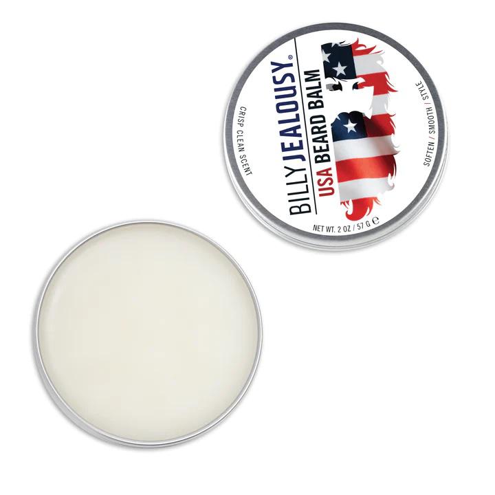 Bless the bearded heroes of our land with Billy Jealousy USA Beard Balm. Loaded with natural ingredients such as shea butter, coconut and castor seed oils, USA Beard Balm deeply conditions the bristliest of beards. Leaves beards feeling soft, manageable and frizz free. Yields greater styling properties than a traditional oil. Celebrate and honor your beard in all its magnificence. Available in 2 oz tins.