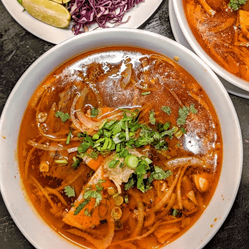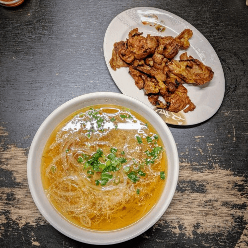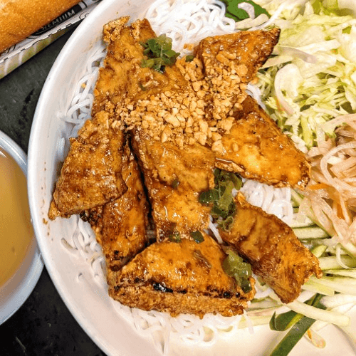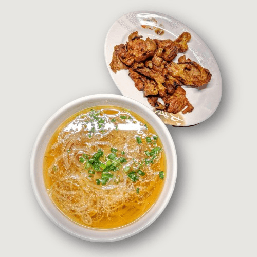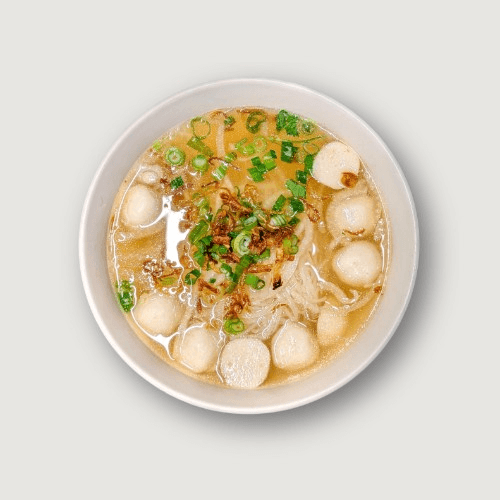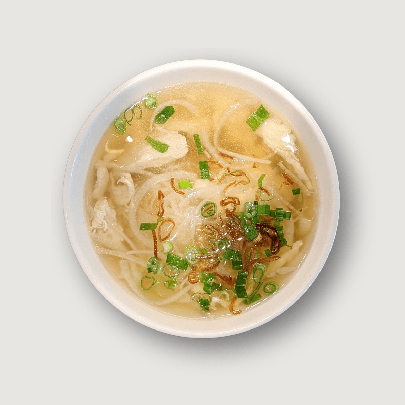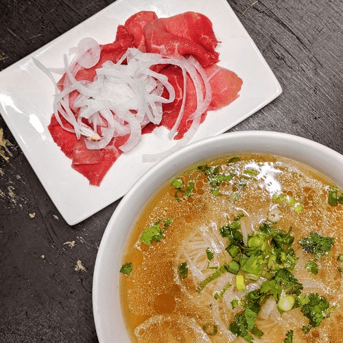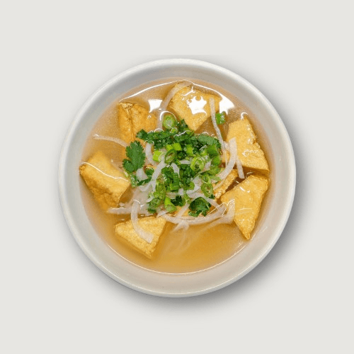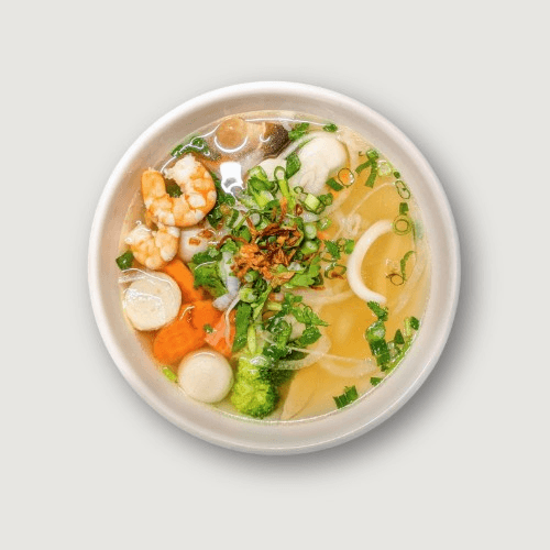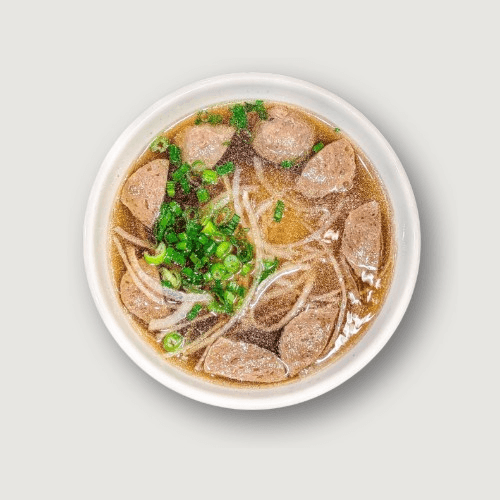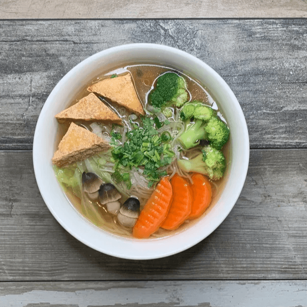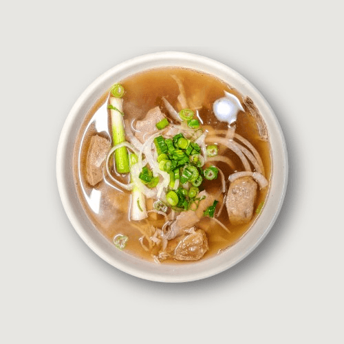 A light, meatless bowl of our signature pho broth and rice noodles, topped with fresh onions, scallions, and bean sprouts. Simple and satisfying.