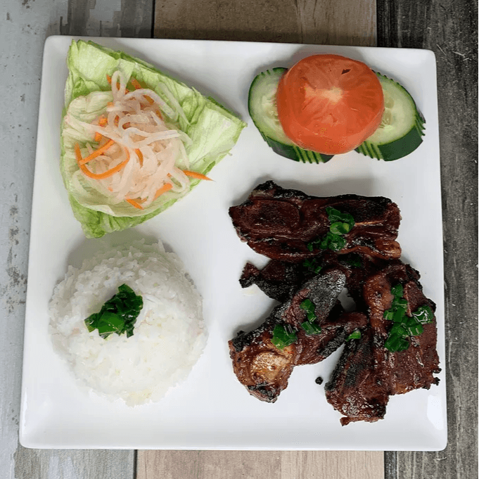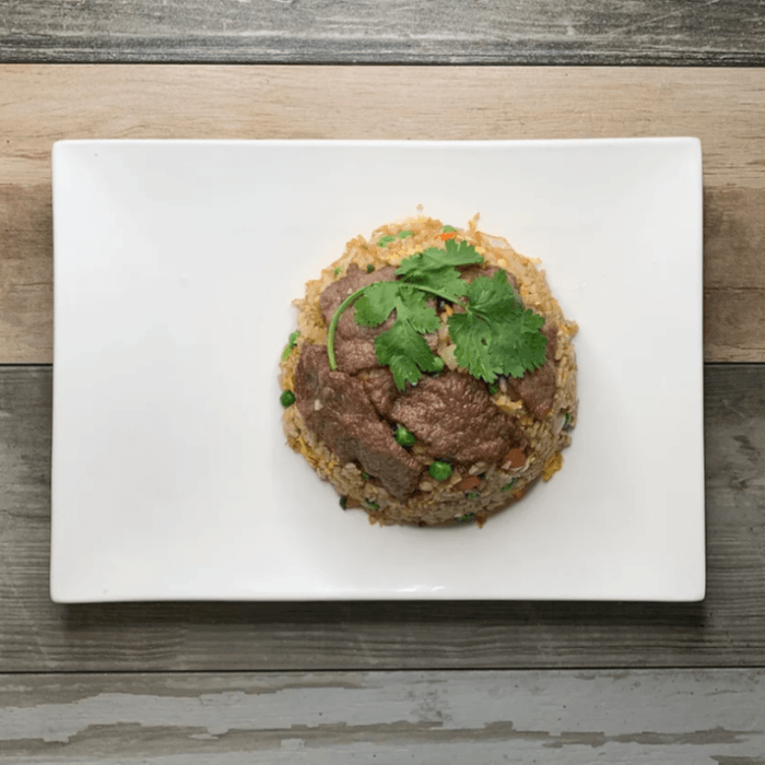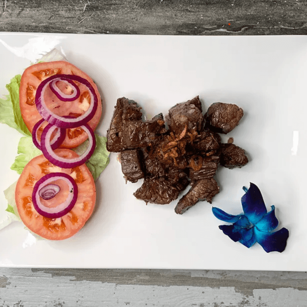 Diced flank steak (10 oz) marinated in a house sauce, pan fried in shallot and black pepper. Served with lettuce, tomato and red onion