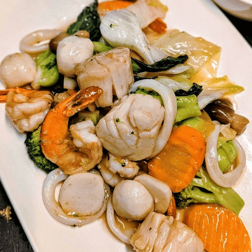 Prawns, scallops, fish balls, calamari, and a mixture of vegetables, wok-tossed in a white sauce
