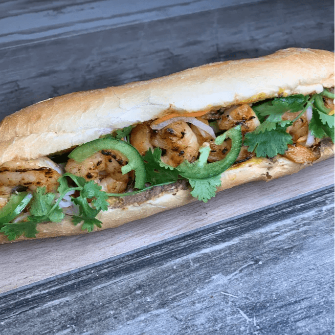 Grilled shrimp, spread of pate and mayo, cucumber, radish pickle, cilantro and jalapenos