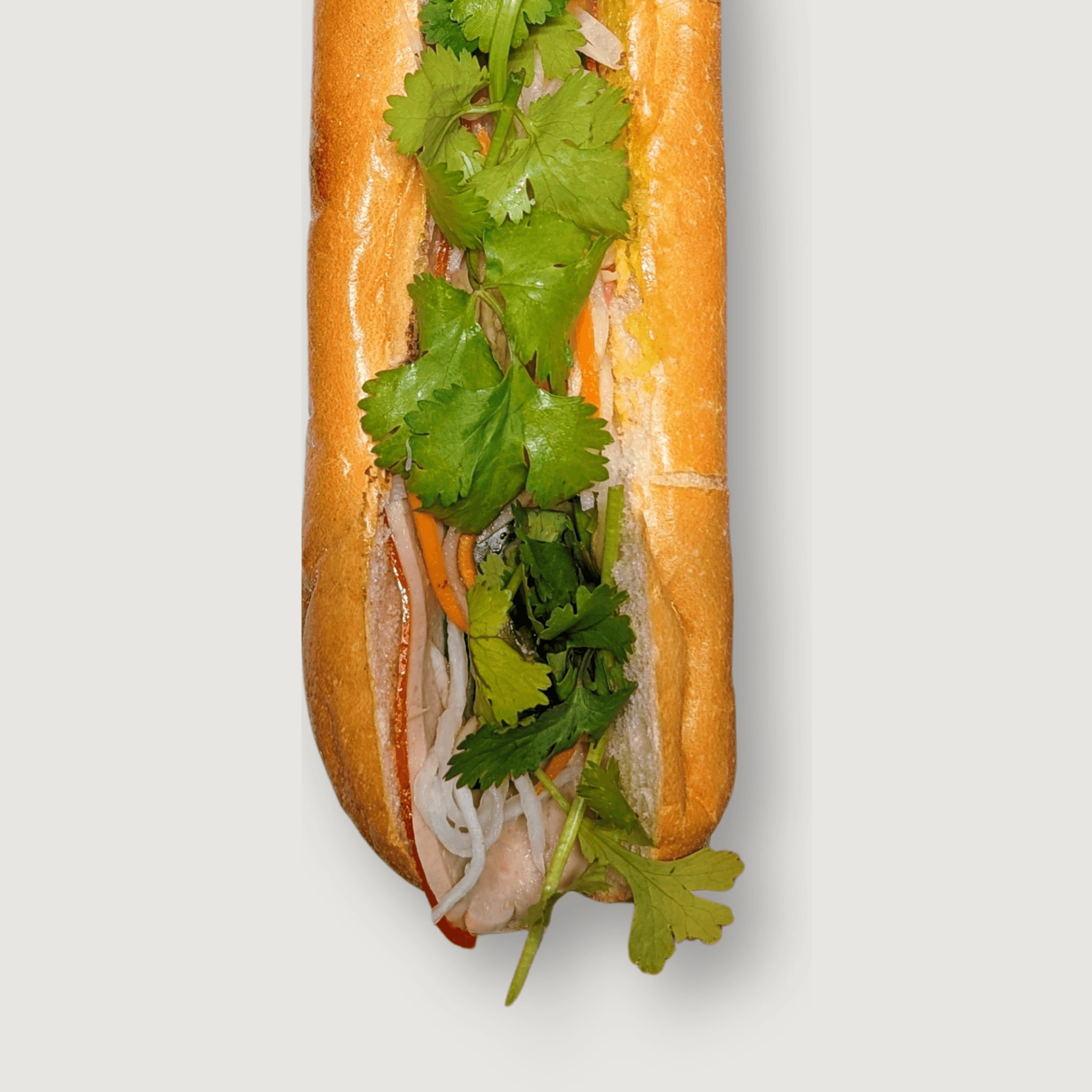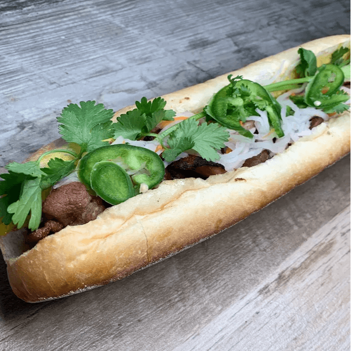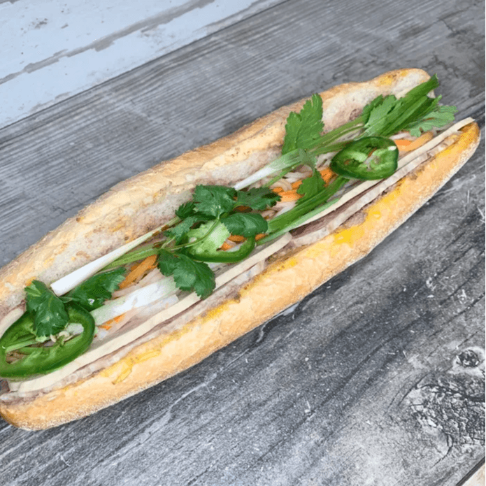 Pressed ham, pork sausage and pork belly, spread of pate and mayo, cucumber, radish pickle, cilantro and jalapenos