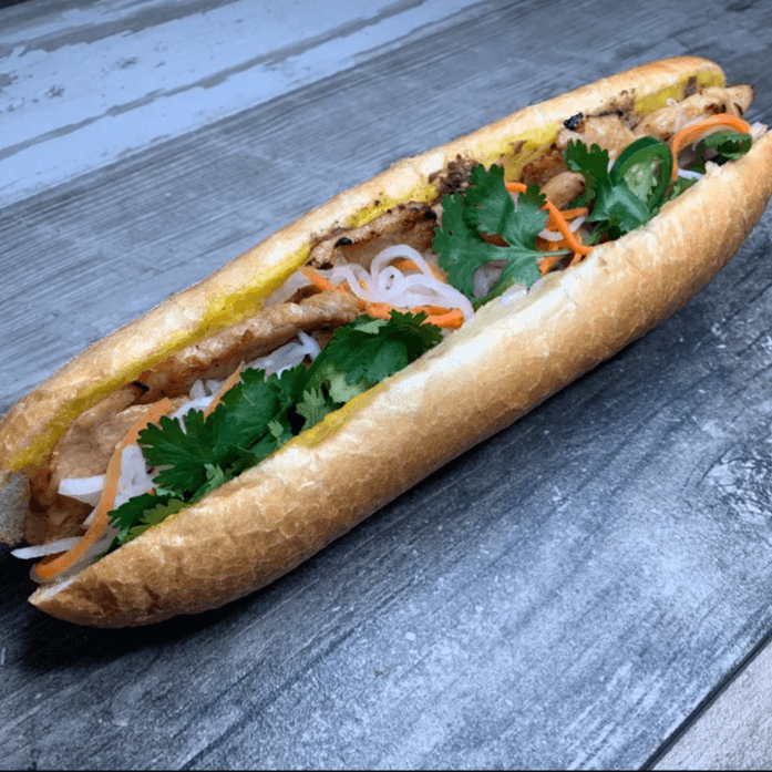 Grilled chicken, spread of pate and mayo, cucumber, radish pickle, cilantro and jalapenos