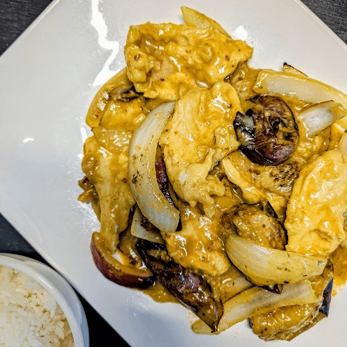 Sauteed with eggplants, sweet potatoes and onions in homemade curry coconut sauce