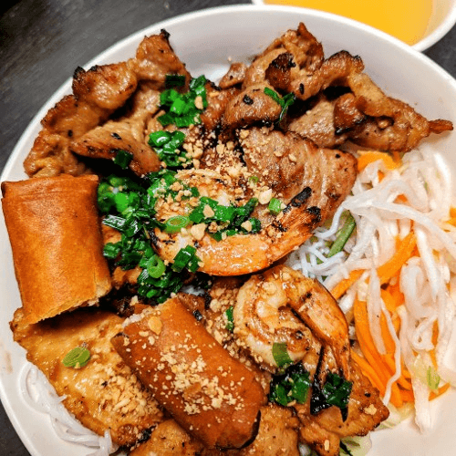 Grilled chicken, pork, and shrimp. Served with a crispy spring roll and vegetables, topped with scallion oil and crushed peanut