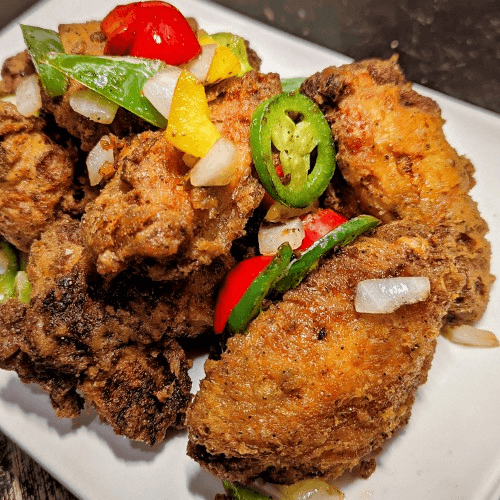Coated crispy shrimp with chopped bell pepper, scallions and fried onion sprinkled in homemade salt and pepper flavor