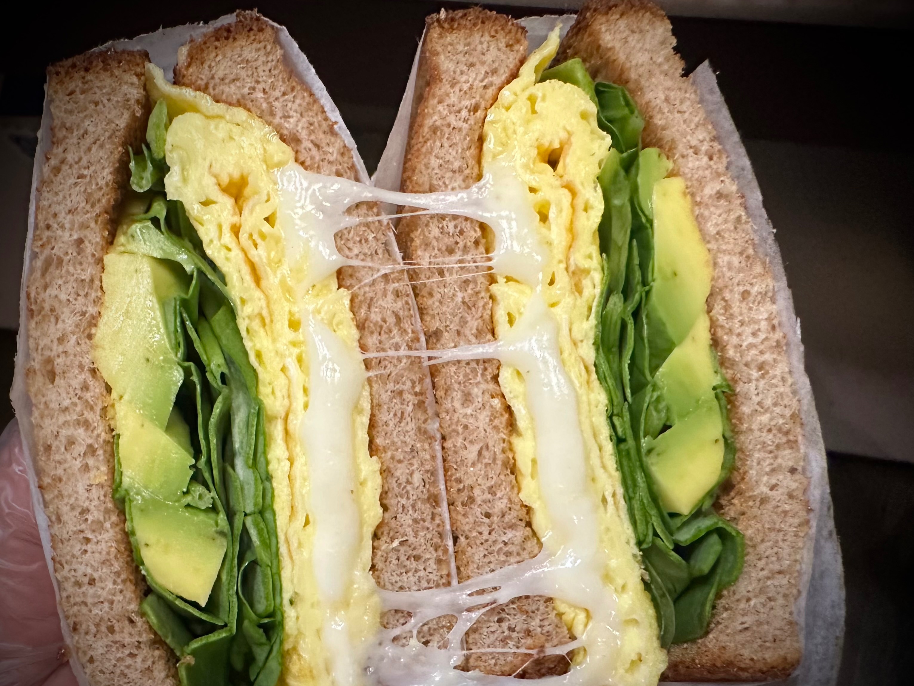Fresh spinach, egg, mozzarella, avocado on wheat toast