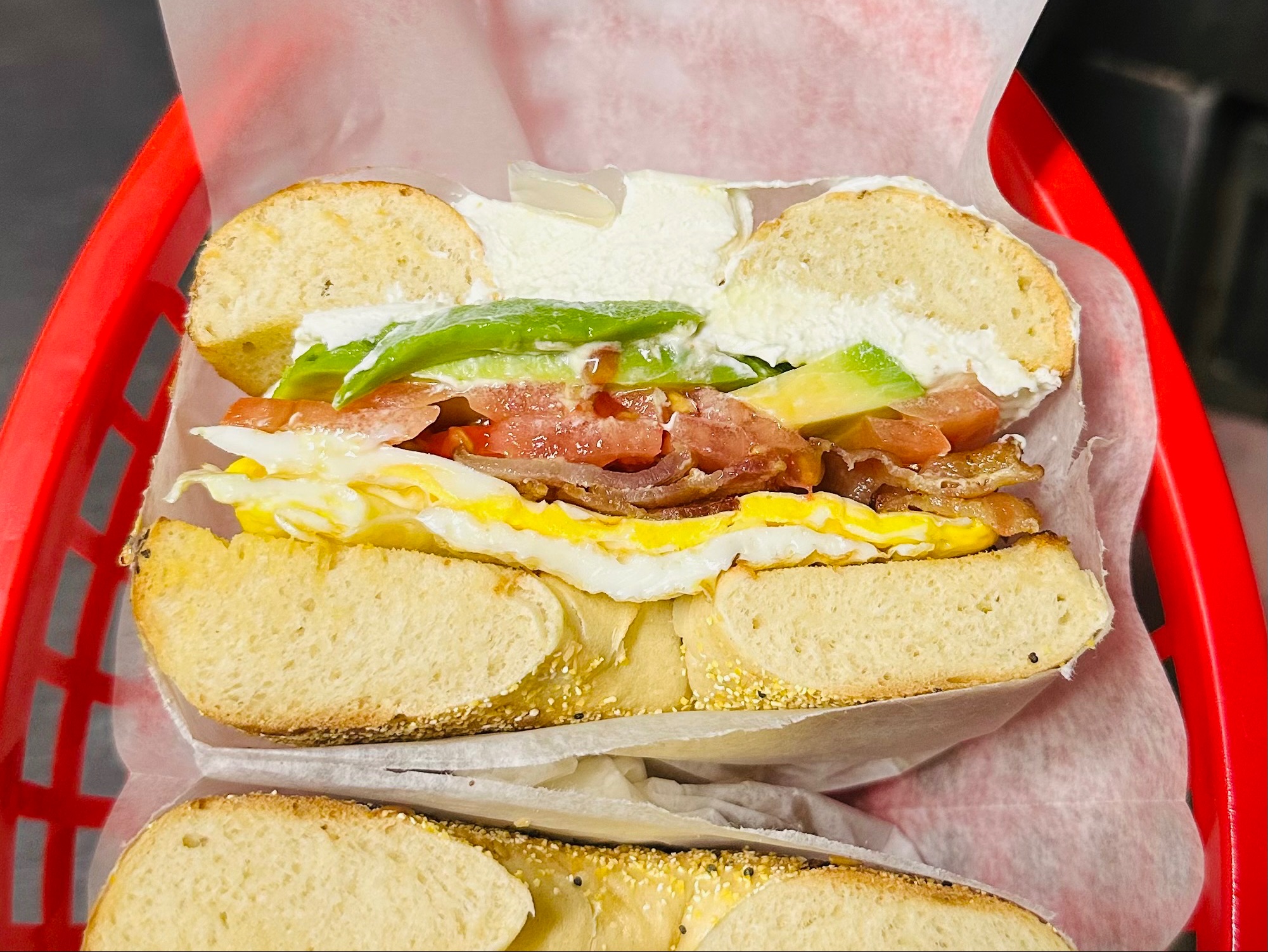 Cream cheese, bacon, avocado, tomato, 1 fried egg on plain bagel