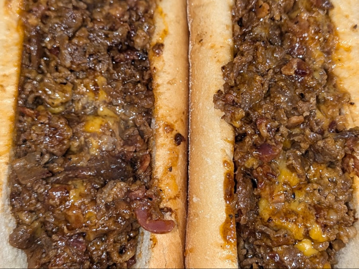 Meat, grilled onion, cheddar, BBQ sauce