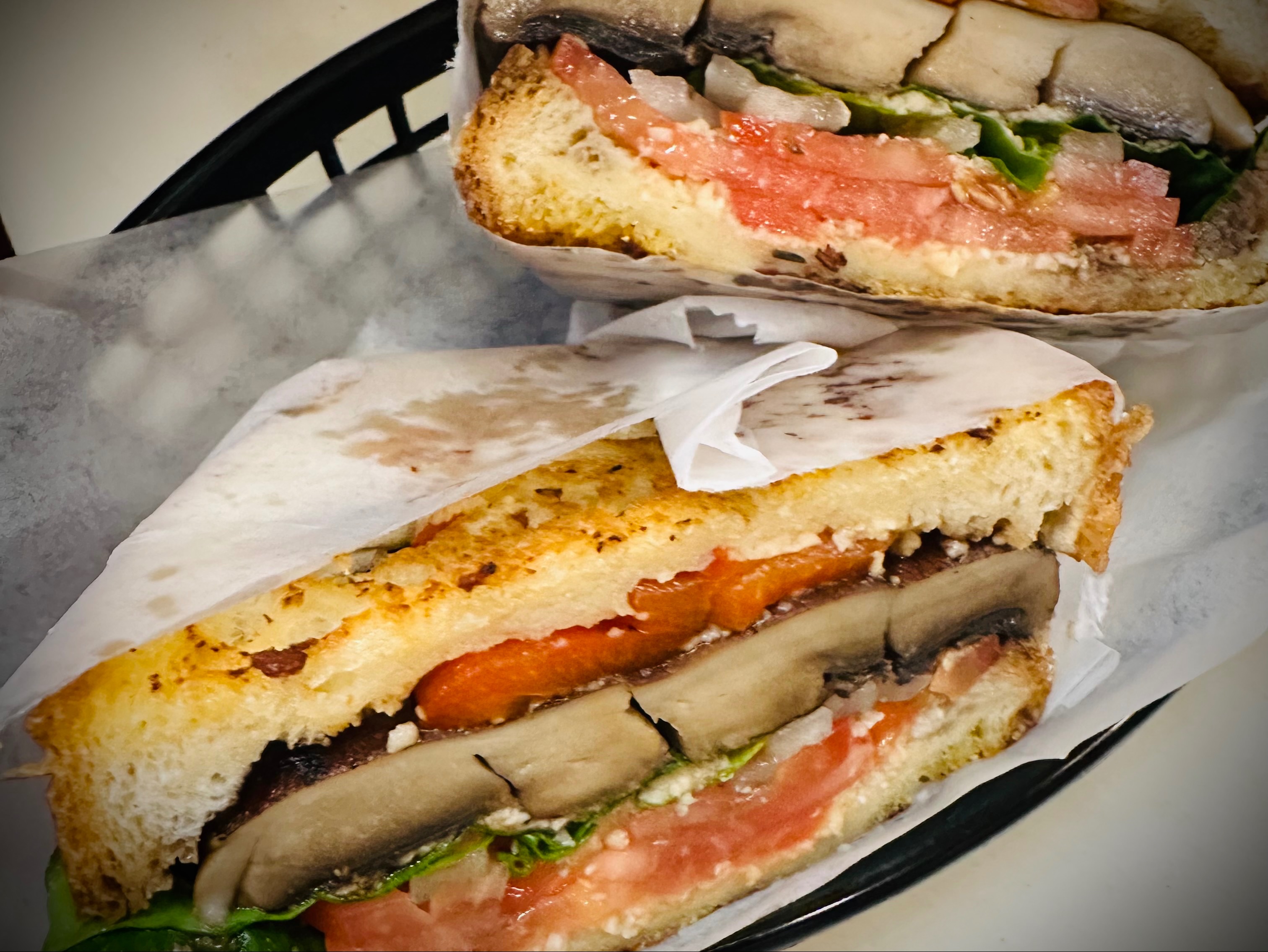 Grilled portobello, parmesan cheese, spinach, tomato, onion, roasted pepper, oil, and balsamic vinegar on roll