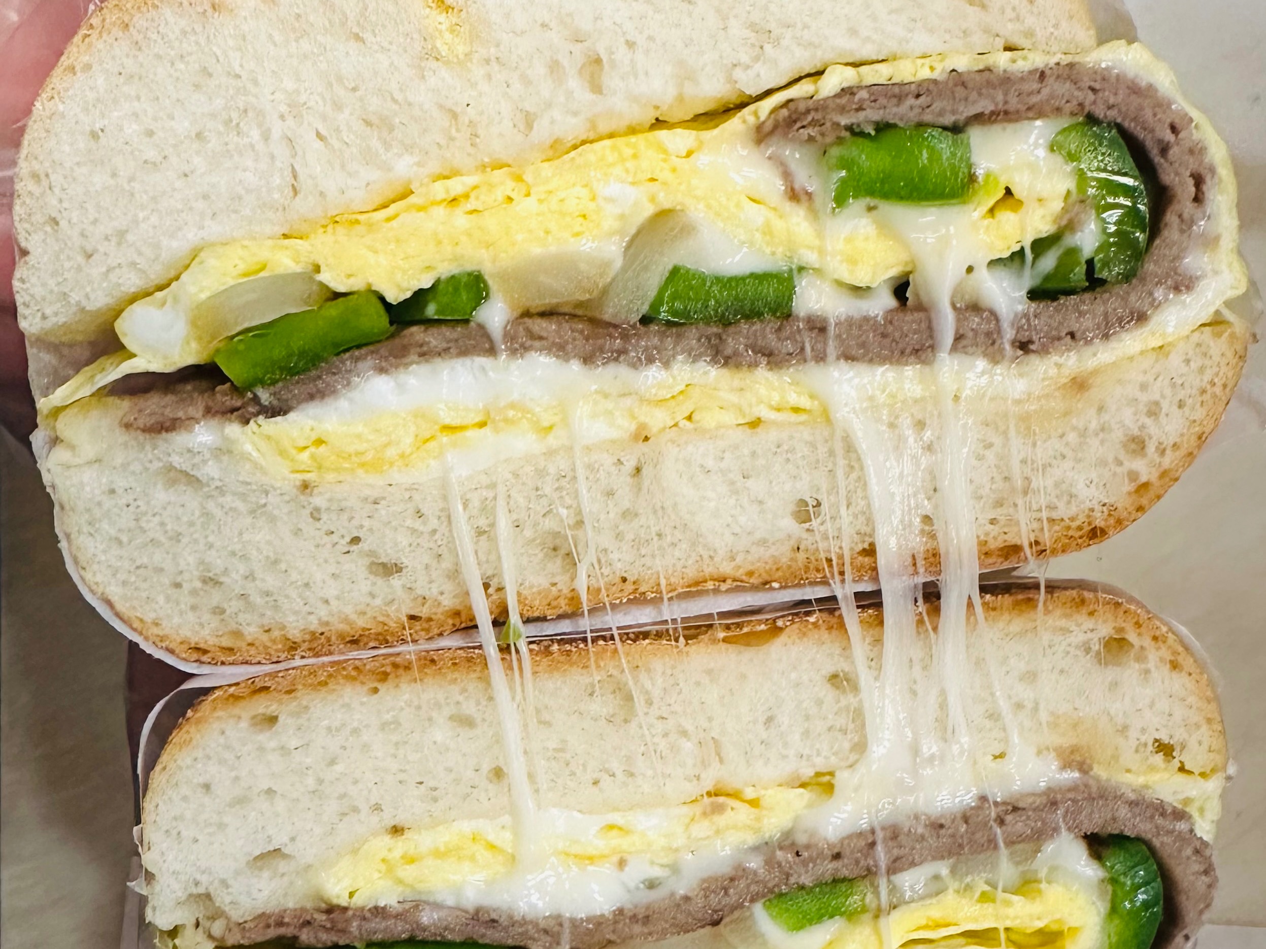 Steaks, green pepper, onion, eggs, mozzarella, kaiser roll