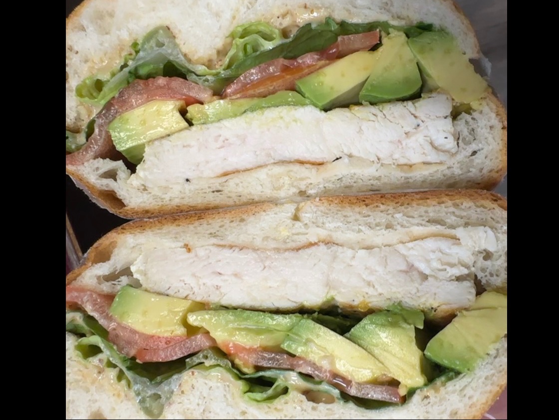 Grilled chicken breast, lettuce, tomato, avocado, and honey mustard on kaiser roll